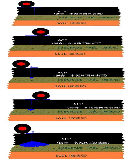 裂縫滲水后會(huì)對(duì)路面產(chǎn)生類似泵送的作用,從而導(dǎo)致路面損壞。以下各圖展示路面產(chǎn)生裂縫后水對(duì)道路的損害過程(圖)