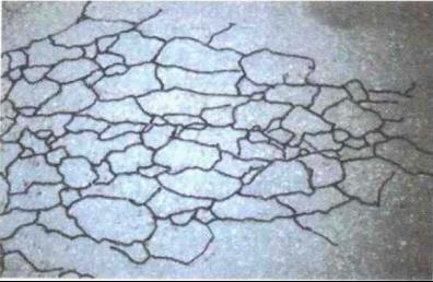 網(wǎng)狀裂縫(如圖3)是由單根裂縫發(fā)展而引起的。其產(chǎn)生原因有:(A)路面的整體強(qiáng)度不足而產(chǎn)生裂縫。(B)路面開始出現(xiàn)裂縫后未及時(shí)封填,致使水分滲入下層,尤其是在融雪期間凍融交加,會(huì)加劇路面的破壞,促使網(wǎng)狀裂縫形成。(C)瀝青在施工期間以及在長(zhǎng)期使用中的老化也是導(dǎo)致瀝青路路面形成網(wǎng)裂的原因之一。